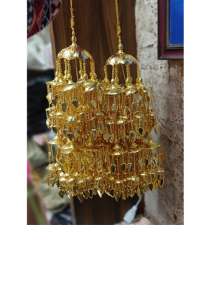 True to its name, the Golden Grace Bridal Kalire radiates effortless beauty and grace. The design features intricately carved golden domes, delicate pearl hangings, and shimmering gold chains that sway with every movement. Each piece is handcrafted, paying close attention to detail—from the filigree work to the fine golden threads that bind the elements together.