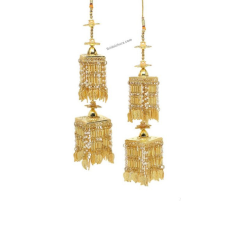 The design of the Golden Wedding Bliss Kalira is both regal and graceful. It typically features multiple layers of finely crafted golden domes or floral elements, adorned with hanging beads, pearls, or tiny charms that sway gently with every movement. The intricate craftsmanship and attention to detail make it a masterpiece that adds grandeur to the bride’s overall look.