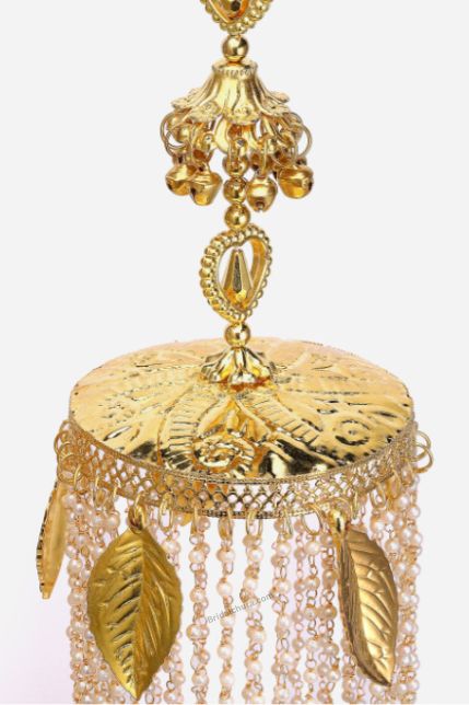 Golden Kaliras exude a timeless charm. Their lustrous finish, delicate craftsmanship, and hanging elements create a mesmerizing effect as they sway with the bride’s movements. Designed with intricate patterns, embellishments like pearls, beads, or miniature charms, and often shaped like domes or umbrellas, they add a regal touch to the bridal attire. The graceful golden hue complements both traditional red lehengas and modern pastel ensembles, making them a versatile and elegant choice.
