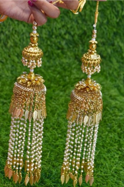 The Dulhan Kalira is typically crafted with golden strings, pearls, and precious stones that create an elegant and graceful design. Some kaliras feature intricate patterns with kundan, stonework, or crystal embellishments to add an extra layer of glamour and richness. Traditionally, it consists of two or more bell-shaped pendants that hang from the bride’s chooda (wedding bangles). These pendants often have long, cascading strings adorned with pearls, crystals, and stones that sway with every step the bride takes, adding movement and charm to her look.