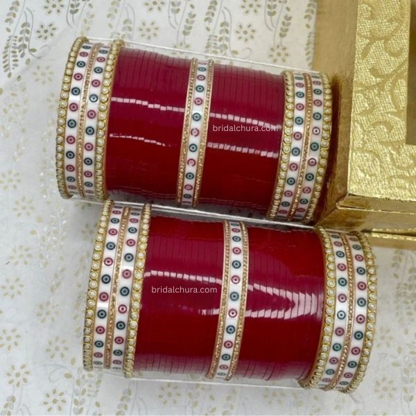 Each bangle in the Chura is designed with precision and care. The glossy ruby-red bangles are perfectly complemented by pearl-detailed kadas, bordered with intricate golden patterns. The high-quality craftsmanship ensures durability, allowing brides to cherish and preserve their chura as a keepsake of their wedding memories.