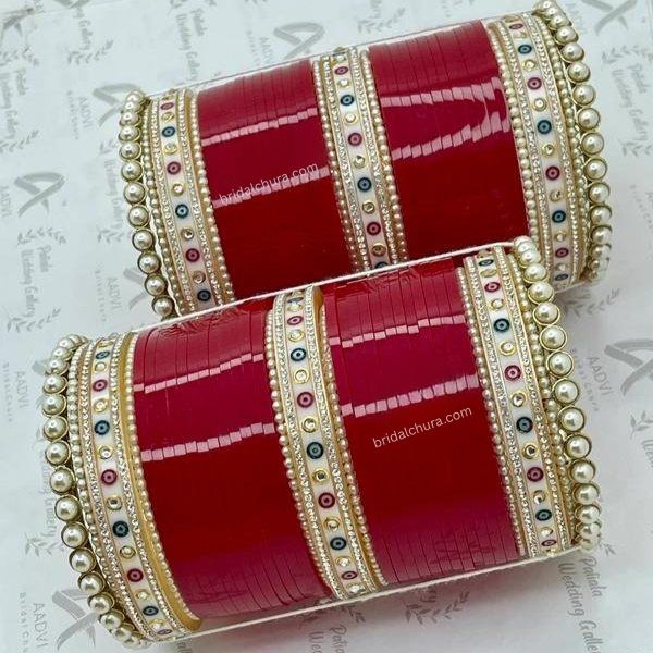 Modern Punjabi brides are increasingly opting for pearl and crystal-adorned chooras. These chooras combine pearls and sparkling crystals with traditional red and white bangles, adding a soft, elegant glow to the bridal look. The soft sheen of pearls along with the shimmer from crystals makes this design perfect for brides who love a blend of traditional charm and modern sophistication.