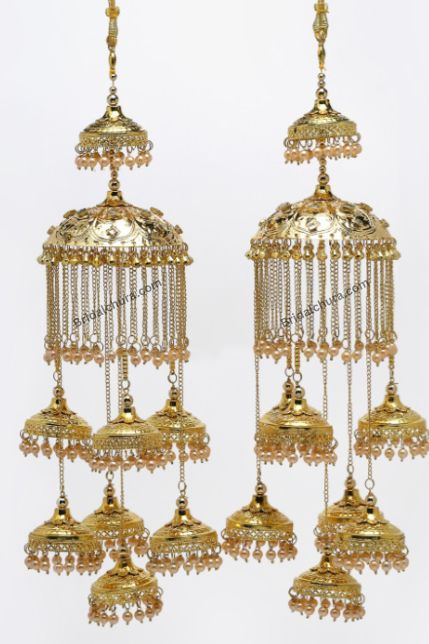 Kaliras (or Kaleere / Kalire) are traditional ornaments that Punjabi brides wear on their wedding days. Generally tied to the bride’s bangles during the Chooda ceremony, they are meant to bestow blessings, fortune, and protective goodwill.Over time, what began as simple dangling tassels or pieces made from dried fruits evolved into ornate metal structures with domes, pearls, charms, and intricate motifs. The dome shape itself draws from architecture and symbolism—domes often represent the heavens or shelter—making each tier a layer of protection and blessings.