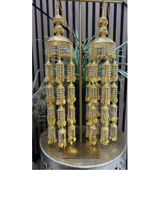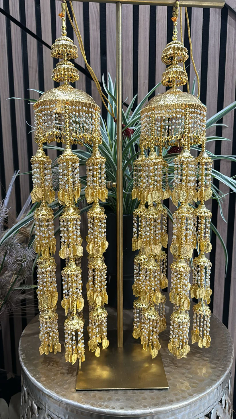 The interplay of shimmering gold with soft ivory or pearl accents makes these kalire incredibly versatile—complementing everything from traditional red bridal lehengas to contemporary pastel ensembles.