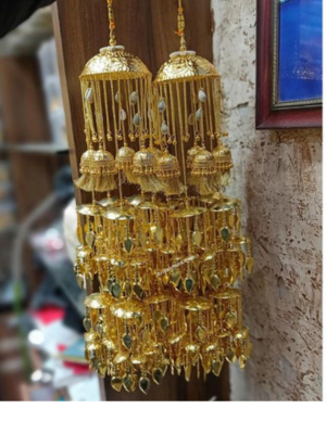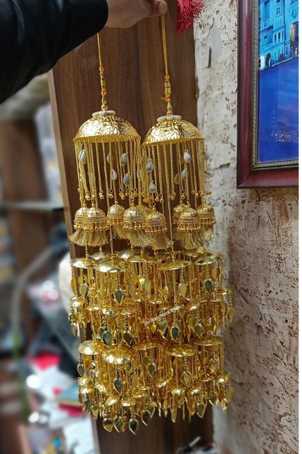 Crafted with fine artistry, this kalira features long golden hangings, delicate beads, and intricate dome work. Its shimmering gold finish creates a luxurious appeal, making every bride shine with regal charm.