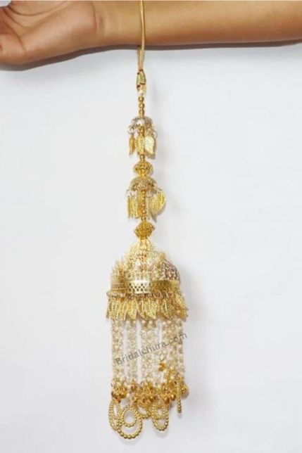 The Velvet Gold Kalire feature dome-shaped golden tops, delicate pearl strings, and finely crafted motifs that reflect royal elegance. Their lightweight yet intricate design ensures they drape beautifully, moving gracefully with every step the bride takes. Some variations even include personalized elements like initials or auspicious charms, making them extra special.