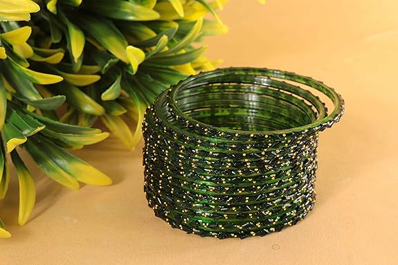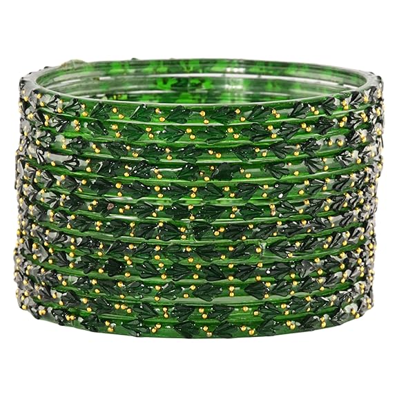 Modern raindrop bangles often include subtle golden accents or crystal embellishments that enhance their luxurious appeal and festive charm. The combination of vibrant green color and sparkling texture makes these bangles perfect for creating a standout look.