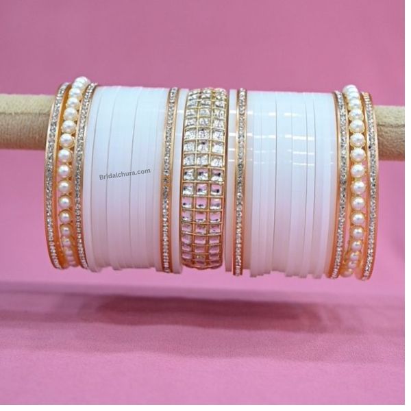 Shopping for a White Chooda Bride set with Kundan pearl bangles online provides convenience and accessibility, allowing brides to explore a wide range of designs, materials, and prices from the comfort of their home. Online platforms offer various options, from simple, elegant designs to more elaborate, ornate sets, catering to every bride’s unique style. Detailed product descriptions and high-resolution images help brides choose the perfect set, while customer reviews offer insights into the quality and craftsmanship of the pieces.